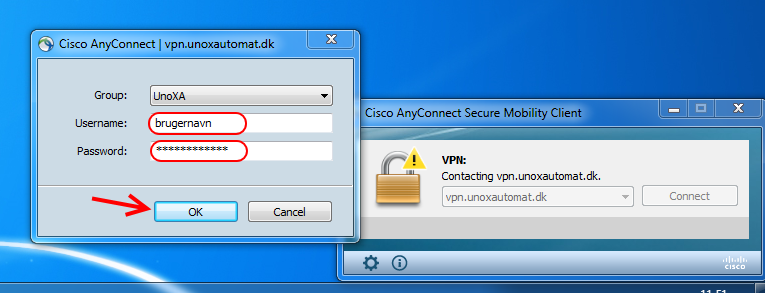 og indtast de krævede oplysninger i boksen: (brugernavn og den adgangskode står i mailen/brevet du har fået) og tryk "OK".