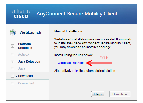 Hvis den automatiske installetion svigter, vises et billede som nedenstående. For at komme videre skal du klikke på linket "Windows desktop".