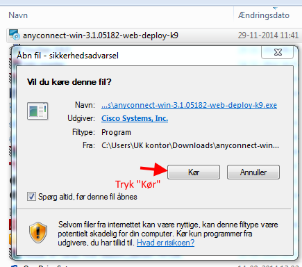 (måske kommer der en ny boks der viser at udgiveren ikke er kendt. Klik igen på "KØR")