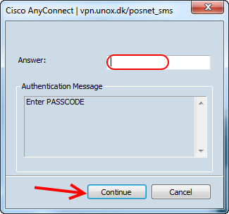 Når du har modtaget SMS, indtaster du koden der står i SMS her, og trykker "Continue".